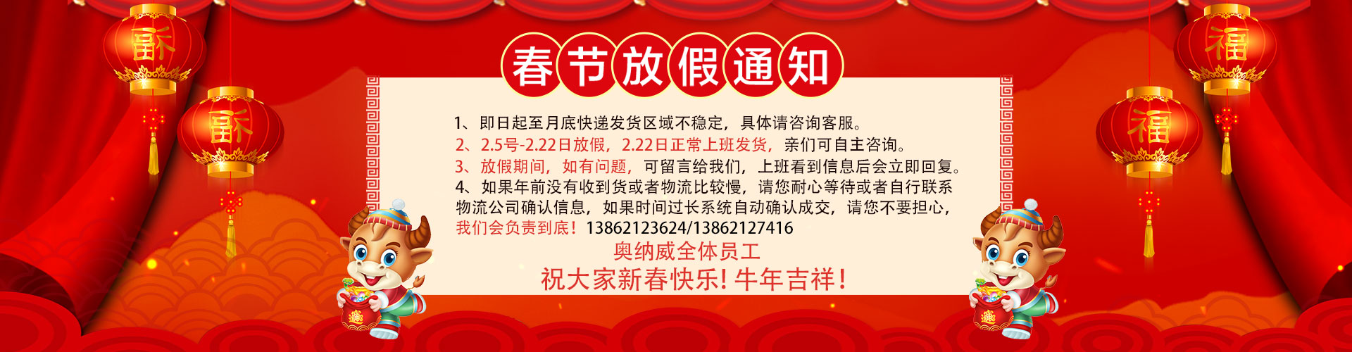 尊敬的客戶,您好,結(jié)合疫情進(jìn)展情況以及本公司的政策,現(xiàn)將本公司2021年年假及春節(jié)放假安排:2021年2月5日---2021年2月19日(正月初八),放假期間安裝及售后暫停服務(wù),業(yè)務(wù)咨詢正常溝通,感謝新老客戶在2020年對(duì)本公司的信任和大力支持,2021年將更加努力把最優(yōu)質(zhì)的服務(wù)給到到客戶,放假期間聯(lián)系電話:13862123624,在此奧納威全體員工提前祝各位老板春節(jié)快樂,財(cái)源廣進(jìn)!